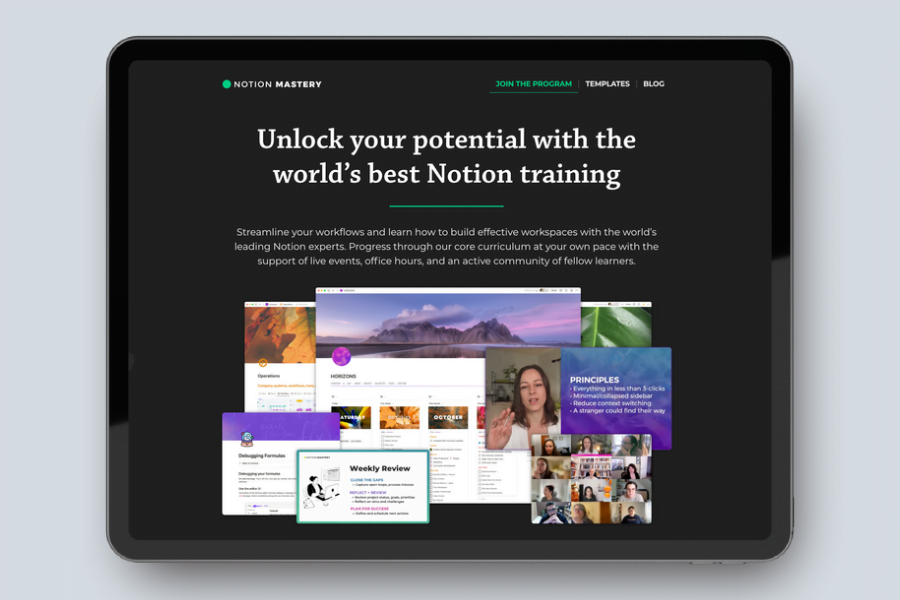 Notion Mastery is a semi-guided learning journey. Go through the core material at your own pace, with the support of live office hours, a helpful community forum, live trainings, and themed workshops.